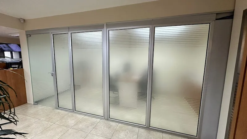 O adesivo jateado reproduz o efeito de vidro fosco, oferecendo privacidade e sofisticação. É amplamente usado em salas corporativas, divisórias e vitrines, podendo receber recortes personalizados e impressões exclusivas.